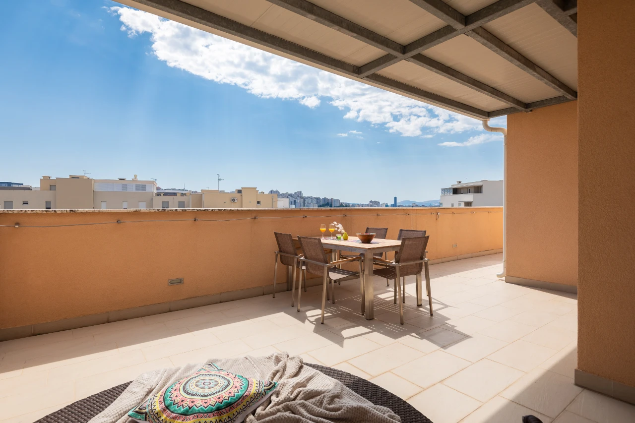 Apartment is on the top floor of a new building with an elevator and has a huge (135 m2) private penthouse terrace. It has 67 m2 of new and fully equipped indoor space with 3 bedrooms, 2 bathrooms, a living room and a kitchen.